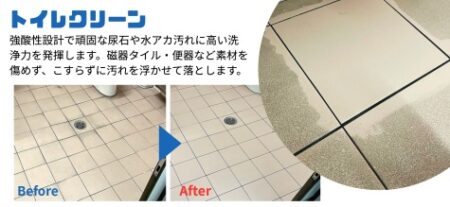 トイレクリーンは、駅や公共施設のトイレで多く使用されている磁器タイル表面に付着した黒ずみ汚れ、便器の尿石・水アカ・スケールなどの無機系汚れに高い洗浄力を発揮する、酸性タイプの液体洗浄剤です。利用頻度が高く、汚れが蓄積しやすい環境でも、汚れを化学的に分解・浮かせることで、床・立ち上がり部・目地周辺の頑固な汚れを効率的に除去。清潔感の回復・維持に貢献します。